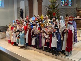 Festlicher Trubel herrschte über das vergangene Wochenende in der Valentinuskirche zu Bann, denn sage und schreibe 55 Kinder waren gekommen, um am Dreikönigssingen teilzunehmen. Am Samstagmorgen trafen sich alle königlich gekleidete Sternsinger/innen in der Valentinuskirche, um den Aussendungssegen zu empfangen, den sie in die Häuser der Gemeinde Bann trugen. Die Pastoralreferentin Ute Garth segnete die Kreide und spendete einen „Gummibärchen-Segen“ für alle anwesenden Kinder. Begleitet von Erwachsenen zogen die Hl.Drei Könige, in Gruppen eingeteilt, von Haus zu Haus und trugen ihre Lieder und Gedichte von Caspar, Melchior und Balthasar vor. Dann schrieben oder klebten sie 20*C+M+B+25 an die Haustür, was soviel bedeutet wie „Christus segne dieses Haus“. Als Belohnung gab es von den Bewohnern großzügige Geldspenden für Kinder in Not und viele Süßigkeiten. So konnten die Sternsinger/innen unglaubliche 7750,- Euro sammeln, die an das Missionswerk überwiesen wurden. Müde und zufrieden trafen sie sich anschließend im Pfarrheim, wo sie sich bei heißen Würstchen und Getränken stärken konnten. Auch am Sonntagmorgen durften die verkleideten Könige nochmals beim festlichen Hochamt, das von Kaplan Bernard zelebriert und vom Kirchenchor feierlich umrahmt wurde, einmarschieren und sich im Chorraum präsentieren. Der Gottesdienst stand unter dem Motto „Rechte für Kinder“, die von den Sternsingerkinder vorgetragen wurden. Alle waren begeistert von dem Engagement der Bännjer Kinder, die diese schöne Tradition weiter am Leben halten. (ge)