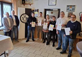 Er lobte vor allem die Jugendarbeit in den einzelnen Altersstufen und bedankte sich bei den Trainern und Betreuern. Auch die aktiven Mannschaften, die in der A- und C-Klasse spielen, hätten sich in dem oberen Tabellenbereich festgesetzt mit durchaus guten Aufstiegschancen. Anschließend wurden einige Mitglieder für ihre 15-, 25- und 50-jährige Mitgliedschaft geehrt (s. Foto). Auch Ortsbürgermeister Michael Klingel war anwesend und sprach einige Grußworte, verbunden mit einer kleinen Geldspende für die Jugendarbeit. Danach konnten sich die Anwesenden bei einem Begrüßungssekt und einem Häppchen-Buffet stärken und die Geselligkeit genießen. (ge)