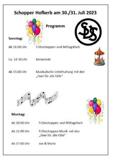 Traditionell feiert der SV Schopp am 30. und 31. Juli 2023 im Hof der ehemaligen Gaststätte „Zur grünen Tann“ seine diesjährige Hofkerwe.