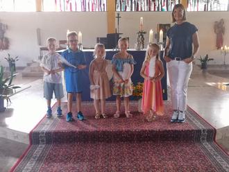 Mit einem rührenden Gottesdienst wurden am letzten Mittwochabend die „Schlaufüchse“, die Vorschulkinder der katholischen KiTa St. Markus auf der Atzel im Beisein ihrer Familien und ihrer Erzieherinnen verabschiedet. Fünf der insgesamt sieben Kinder gestalteten den von Pfarrer König geleiteten Gottesdienst mit Liedern, Tänzen und einer liebevoll vorbereiteten Vorführung zum Thema „Engel, die uns begleiten“. Mit ihrer Bezugserzieherin hatten die Schlaufüchse in den letzten Wochen ihrer Kindergartenzeit fleißig geübt. Mit ihrem Stück führten die Kinder allen Gästen noch einmal vor Augen dass nur ein bisschen Mitmenschlichkeit und Nächstenliebe bedarf um hier auf der Erde ein Engel für andere zu sein.
