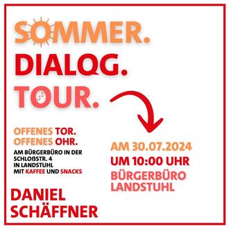 Unter dem Motto „Offenes Tor, offenes Ohr“ lädt der SPD-Landtagsabgeordnete Daniel Schäffner herzlich alle interessierten Bürgerinnen und Bürger zu Kaffee und Gesprächen in und vor seinem Wahlkreisbüro, Schloßstr. 4, Landstuhl, ein. Wer sich gerne über landes- und kommunalpolitische Themen austauschen will oder sich mit einem persönlichen Anliegen an den Abgeordneten wenden möchte, der ist am Dienstag, 30. Juli 2024, ab 10.00 Uhr, herzlich willkommen!