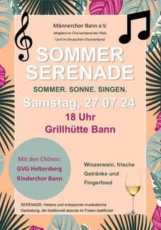 Der Männerchor Bann lädt am Samstag, 27.07.2024 ab 18:00 Uhr zur 1. Bännjer Sommerserenade an der Grillhütte Bann am Sportplatz ein. Der Abend wird mit Liedern vom Männerchor Bann, dem Männerchor und dem Frauenchor vom GVG Heltersberg und vom Kinderchor aus Bann musikalisch gestaltet. Alle Mitbürger und Musikfreunde sind eingeladen musikalische Genüsse zu erleben und mit erlesenen Winzerweinen, kühlen Getränken und Fingerfood den Abend zu genießen. Der Eintritt ist frei, über eine Spende würden wir uns sehr freuen.