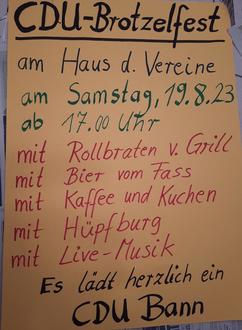 Es ergeht herzliche Einladung zum CDU-Brotzelfest am kommenden Samstag, den 19.8.23 ab 17.00 Uhr am Haus der Vereine in Bann.