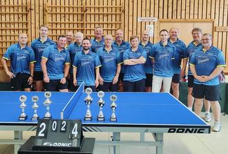 Auf dem Vereinsgelände war der Parkplatz an diesem Samstagmorgen gut belegt, da 16 Aktive aus den drei Wettkampfteams und ein Gastspieler sich um den Wanderpokal des Vereinsmeisters bewarben. In vier Gruppen wurden im Jeder gegen Jeder-Modus auf drei Gewinnsätze gespielt. Die vier Ranghöchsten waren dabei gesetzt, der Rest wurde zugelost. Die beiden Ersten qualifizierten sich für das Viertelfinale, und für die Anderen ging es in die Trostrunde. Turnierdirektor Thomas Martin hatte mit musikalischer Begleitung für eine tolle Vorbereitung gesorgt, und dank guter Verpflegung durch Michael Stumpf starteten die Teilnehmer mit bester Laune in den Wettkampf. Warmes Traumwetter und heiße Duelle sorgten für eine spannende und heitere Atmosphäre bei steter Flüssigkeitszufuhr durch unseren Wirt Nico. Nach dem Mittagessen standen die Finalspiele im Einzel auf dem Programm, wobei sich Favorit „Kutschi“ Bönsch durchsetzte. Michael Stumpf wurde Vize und Ahmad Kadi vervollständigte die prima Bilanz der Zweitmannschaftsspieler. Die Trostrunde gewann Sven Maske, gefolgt von dem furios aufspielenden Michael Schneider und dem Dritten Uwe Müller. Alle erhielten Pokale, die sogleich auf Tauglichkeit als Trinkgefäße getestet wurden. Die Doppelpaarungen fanden sich per Lotterie, und dort siegte die Paarung Bönsch/Müller im Endspiel gegen Nothof/Schneider, während sich Kettenring/Kadi den dritten Platz erkämpften. Der Ausklang des gelungenen Tages fand anschließend auf dem Dorfplatz bei der Kerwe statt. Glückwunsch an die Titelträger und vielen Dank an alle Mitwirkenden und Besucher, die zu einem schönen Vereinserlebnis beigetragen haben.