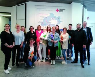 Stehend von links nach rechts: Einrichtungsleiterinnen Carolin Glaser, Martina Mack und Nicole Müller, die beiden Praxisanleiterinnen Susanne Laufer und Heike Christmann, Auszubildende Claudia Daussener-Friedel, Christina Mischke, Angela Drexler, Maria Iuliana Boata-Margerit, Magdalena Smolka, Angelo Boata-Margerit und Tina Fatscher (vorne) sowie die beiden Geschäftsführer Jan Müller und Michael Nickolaus.