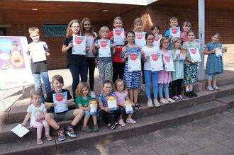 Stolz präsentieren ein Teil der Lese- und Vorlesesommer-Kinder ihre Urkunden
