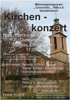 Der MGV Concordia veranstaltet am 6. Oktober 2024, ab 17.00 Uhr ein Konzert in der katholischen Kirche St. Antonius in Queidersbach, unter der Leitung unseres Chorleiters Heribert Molitor. Während des Konzerts werden Werke von Franz Schubert, Ludwig van Beethoven, Cesar Franck, u.a dargeboten. Die Ausführenden sind: