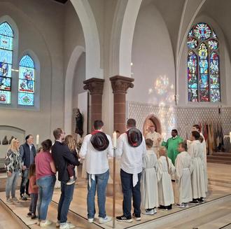 im Duett zur Kommunion sang. Pfarrer Kiran hob in seiner Festpredigt hervor, dass alle Gläubigen Steine sind im Gebäude der Weltkirche und damit zur kirchlichen Gemeinschaft gehören. Auch 2 Straußbuben waren gekommen um die Kerwe-Messe mitzufeiern. Nach dem Schlusssegen wünschte Pfarrer Kiran fröhliche Kerwetage und die Messdiener verteilten „Schaumküsse“ an die Gottesdienstbesucher. Unsere Aufnahme zeigt die Messdiener, Straußbuben und Kinder mit Eltern beim gemeinsamen „Vater unser“ rund um den Altar. (ge)