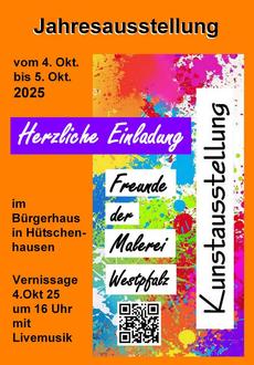 Die Freunde der Malerei-Westpfalz präsentieren am 04. und 05.10.2025 ihre Jahresausstellung im Bürgerhaus in Hütschenhausen, zu der wir Sie ganz herzlich einladen.