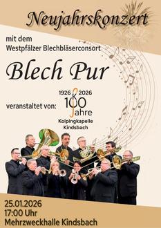 Am 25.01.2026 um 17:00 Uhr lädt das Westpfälzische Blechbläserconsort Blech Pur zum Neujahrskonzert in die Mehrzweckhalle Kindsbach ein. Das Konzert bildet nicht nur einen musikalischen Auftakt in das neue Jahr, sondern markiert zugleich den Start in das Jubiläumsjahr der Kolpingkapelle Kindsbach.
