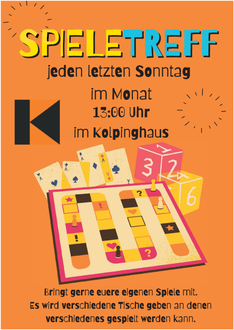 Am Sonntag, dem 25.01.2026, findet um 13:00 Uhr der nächste monatliche Spieletreff für Jung und Alt im Kolpinghaus statt. Es werden verschiedene Spiele vor Ort sein, aber es kann auch jeder eigene Spiele mitbringen. Wir freuen uns auf einen Nachmittag mit viel Spaß.