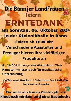 Mit einem ausgesuchten Programm wollen die Bännjer Landfrauen das traditionelle Erntedankfest in Bann wieder aufleben lassen. Die Veranstaltung findet am Sonntag, 06. Oktober 2024 in der Steinalbhalle in Bann statt. Hierzu laden wir Sie herzlich ein.