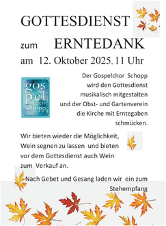 Sonntag, 12.10.2025, 11:00 h Gottesdienst zum Erntedank
