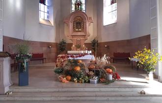 Seit 1972 feiert die katholische Kirche am ersten Sonntag im Oktober das Erntedankfest. Die Mitglieder des Gemeindeausschusses „Mariä Heimsuchung“ in Kindsbach, zusammen mit ihren Partnern, ließen es sich auch in diesem Jahr nicht nehmen, den Altar des Gotteshauses festlich zu schmücken und vor dem Altar Früchte der Felder und Gärten in große Vielfalt auszubreiten.
