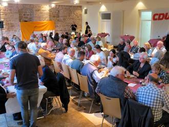 Voll besetzt war die Zehntenscheune der Sickingenstadt beim diesjährigen Pfälzer Abend des CDU-Stadtverbandes Landstuhl. Vorsitzender Mattia De Fazio hieß die Gäste gemeinsam mit seinen beiden Stellvertretern Christopher Bretscher und Gerhard Malinowski, sowie Vorstandsmitglied Elke Dick herzlich willkommen.