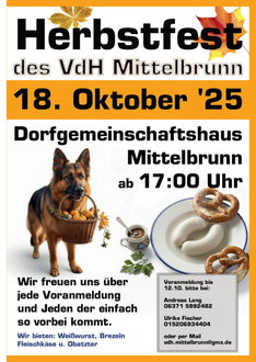 Damit wir besser planen können, bitten wir um Voranmeldung bis zum 12.10.2025 - per E-Mail: vdh.mittelbrunn@gmx.de oder Telefon: 06371-5992482 mobil: 01520 6934404 – aber auch spontane Gäste sind herzlich willkommen!