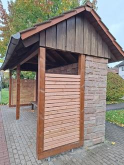 Pünktlich zum Schulbeginn nach den Herbstferien zeigen sich die beiden Bännjer Buswartehäuschen am südlichen Ortsausgang wieder in einem sehr ansehnlichen Zustand, vor allem aber in einer stabilen und sicheren Beschaffenheit. Über Jahre hinweg nagte die nasse Witterung und extreme Bodenfeuchtigkeit, mit bereits einsetzender Fäulnis an den Holzträgerpfosten und Seitenwandverkleidungen, was die Tragfähigkeit der Dachkonstruktion durch Instabilität zum enormen Sicherheitsrisiko für Leib und Leben werden ließ. Durch eine ortsansässige Zimmerei wurden sämtliche durch Verfall gefährdeten tragenden Holzelemente fachgerecht neu gezimmert und auch mit neuen Stahl-Bodenträgerfüßen installiert, sodass sich die Wartehäuschen jetzt wieder in einem soliden und somit sicheren Erhaltungszustand zeigen. Für den fachmännischen Einbau und das Verschalen der seitlichen Wände mit Douglasien-Rhombusleisten, hergestellt vom Sägewerk Vatter in Schopp, erklärten sich mit Roland Schmidt und Andreas Leidner zwei handwerklich begabte Gemeinderatsmitglieder spontan dazu bereit, diese Arbeiten zu übernehmen. Durch diesen ehrenamtlichen Einsatz hat sich die Fertigstellungszeit enorm verkürzt und auch der Gemeindekasse so nebenbei auch noch eine Menge Geld erspart – dafür Seitens der Gemeinde ein herzliches Dankschön! (ro.)