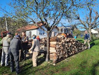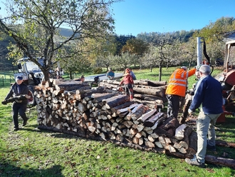 Am vergangenen Samstag herrschte bei schönem Herbstwetter reger Betrieb auf der schönen Streuobstwiese des Obst- und Gartenbauvereins Bann im Tälchen. Denn die Vorstandschaft hatte zu einer Holzaktion aufgerufen, um das gelieferte Polterholz zu schneiden und aufzuhocken, damit für die nächste Zeit das Vereinsheim geheizt werden kann. Innerhalb von 2 ½ Stunden wurden fast 10 Festmeter Holz in 1m-Stücke zersägt und fachmännisch gelagert und abgedeckt. Als kleines Dankeschön für die saubere Arbeit der anwesenden Mitglieder gab es gegrillten Rollbraten, der von Franz Gros schmackhaft zubereitet wurde. In gemütlicher Runde saß man um das Grillfeuer und genoss den Duft des Bratens. Pünktlich zur Mittagszeit waren die knusprigen Rollbraten gar und mit Kartoffelsalat und Fassbier schmeckte alles hervorragend. (ge)
