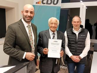 CDU-Stadtverbandsvorsitzender Mattia De Fazio (links im Bild) hat gemeinsam mit seinem Stellvertreter, Gerhard Malinowski, sieben Mitgliedern für ihre langjährige Mitgliedschaft in der Christlich-Demokratischen-Union mit einer Urkunde, einer Flasche Wein und einer Ehrennadel gedankt und deren Engagement für die Partei gewürdigt.