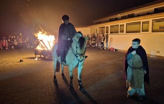 Ein Laternenmeer folgte dem Pferd mit dem hl. Martinus, dargestellt von Lisa Schmitt, und dem Bettler, gespielt von Paul Borst zum Platz vor dem HdV. Musikalisch wurde der lange Umzug von den Westpfälzer Musikanten, die bekannte Martinslieder spielten, umrahmt. Die Feuerwehr entzündete ein Riesenfeuer und Sabine Borst verlas die Martinsgeschichte, wobei St. Martin im Schein des Feuers seine Mantelhälfte dem Bettler übergab. Dann konnten sich die vielen Teilnehmer bei Glühwein, Punsch, Waffeln und Würstchen stärken. Die Feuerwehr verteilte noch an jedes Laternenkind eine Brezel. Alle waren sich einig, dass diese Martinsfeier gelungen war und das dörfliche Gemeinschaftsgefühl stärkte. (ge)