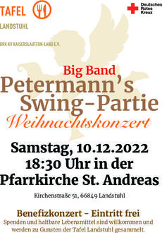 Nicht nur Menschen, die sich für Swingmusik begeistern, sollten die Gelegenheit nutzen, bei dem eintrittsfreien Konzert am Samstag, 10. Dezember um 18:30 Uhr die Petermann’s Swing-Partie kennenzulernen. Die Big Band wurde von Klaus Petermann bereits 1983 gegründet und ist überregional aktiv. Mit sehr viel musikalischer Leidenschaft spielen die erfahrenen Musikerinnen und Musiker aus der Westpfalz ehrenamtlich und unentgeltlich für unsere Heimatregion ein Benefizkonzert zu Gunsten der Tafel Landstuhl. Spenden sind sehr willkommen, das können auch haltbare Lebensmittel sein, die an die Tafelfamilien weiter verteilt werden. Freuen Sie sich auf ein musikalisches Highlight in der Vorweihnachtszeit für den guten Zweck. Mehr Informationen bei Kim Britz, Tafel Landstuhl, Telefon 06371 921539, tafel@kv-kl-land.drk.de
