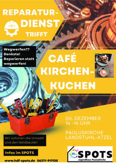 Ab dem 6.12. gibt es im Haus der Familie Spots in regelmäßigen Abständen die Möglichkeit, seine kaputten Geräte reparieren zu lassen. Im Rahmen des Café Kirchen-Kuchen, im Obergeschoss neben der Kirche, kann man sich nun von 14 bis 16 Uhr zu Kaffee und Kuchen verabreden und gleichzeitig eine Reparatur in Anspruch nehmen.