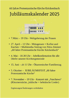 Dieses Jahr feiern wir das 60. Jubiläum der Indienststellung der Protestantischen Kirche – ehemals Gemeindehaus – in Krickenbach am Erntedankfest 1965.