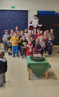 Große Aufregung im Kindergarten "Pusteblume" in Mittelbrunn als es an der Haustür klopfte. Ganz brav und aufgeregt saßen die Kinder im Stuhlkreis und staunten als der Nikolaus mit seinem großen und schweren Sack den Raum betrat. Nachdem er sich hingesetzt hatte konnte er in die vielen leuchtenden Augen schauen. Zur Begrüßung sangen die Kinder ihm ein schönes Lied. Gespannt beobachteten die Kinder den Nikolaus als er sein Buch aufschlug. Mucksmäuschenstill war es im Raum als er eine Geschichte vorlas. Nun wollten die Kinder vom Nikolaus wissen was er in seinem großen Sack versteckt hat. Ja, was ist dass denn? Lauter kleine Säckchen gefüllt mit Nikoläuse, Nüsse, Mandarinen, Äpfel und Süßigkeiten. Jedes Kind bekam ein Säckchen vom Nikolaus überreicht. Als Dankeschön sangen sie ihm noch einmal ein Lied. Die Kindergarten Leiterin Silvia German bedankte sich beim Nikolaus, dass er auch in diesem Jahr den Kindergarten besucht hat.
