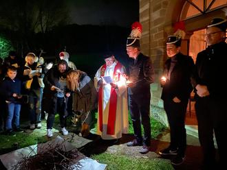 In Bann wird alljährlich die alte Tradition des Barbarafestes gefeiert, denn am Ortsende steht schon seit dem 18. Jahrhundert eine Barbara-Kapelle mit einer schönen Barbarastatue. Der 4.Dezember ist der Namenstag der hl.Barbara, die als Schutzpatronin der Bergleute, der Kanoniere und der Baumeister verehrt wird. Nach dem I.Weltkrieg wurde in Bann ein Knappenverein „St.Barbara“ gegründet, weil viele Bännjer Bergleute in den saarländischen Kohlengruben ihr Brot verdienten. Der Verein trug bei Festlichkeiten immer die schwarzen Uniformen der Grubenarbeiter und bestand bis 1990. Nachkommen dieser Bergarbeiter tragen deshalb heute noch diese Uniform am Barbaratag. So auch am letzten Mittwoch abend, als sich nach einem Gottesdienst in der Valentinuskirche viele Gläubige an der Barbarakapelle einfanden, wo dann Pfarrer U. Stenz eine kleine Feier mit Gebeten und Liedern zelebrierte. Höhepunkt der Zeremonie war die Segnung der Barbara-Zweige. Denn wenn man die gesegneten Kirschzweige im warmen Zimmer aufstellt, dann erblühen sie bis Weihnachten. Es ist lobenswert, dass solche alte Traditionen in Bann noch aufrecht erhalten werden.(ge)