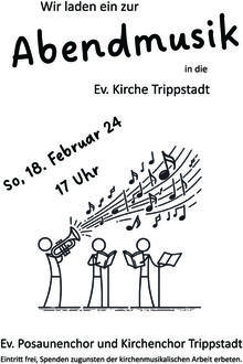 Abendmusik von Kirchenchor und Posaunenchor am Sonntag, 18.02.2024, 17.00 Uhr in der ev. Kirche Trippstadt. Der Eintritt ist frei! Um Spenden für die kirchenmusikalische Arbeit wird gebeten.
