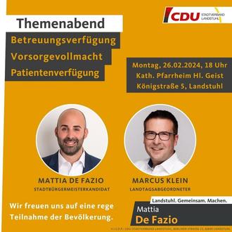Der CDU-Stadtverband lädt am Montag, 26. Februar, 18 Uhr, zu einem Themenabend ins Katholische Pfarrheim, Königstraße 5 in Landstuhl ein. Der Landtagsabgeordnete Marcus Klein referiert zum Thema „Patientenverfügung, Vorsorgevollmacht und Betreuungsverfügung“. Eine schwere Erkrankung oder ein Unfall können selbstbestimmte Entscheidungen unmöglich machen. Der Jurist klärt über Patientenrechte in diesen Fällen auf und erläutert die Begrifflichkeiten. Die Landstuhler Christdemokraten mit ihrem Vorsitzenden und Stadtbürgermeisterkandidaten Mattia De Fazio freuen sich auf eine rege Teilnahme bei diesem wichtigen Thema. (bor.)
