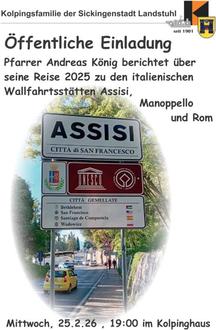 Die Kolpingsfamilie Landstuhl lädt herzlich zu einem Bildervortrag am Mittwoch, den 25.02.2026 um 19:00 Uhr ins Kolpinghaus ein. Pfarrer Andreas König wird zu den Wallfahrtsorten Assisi, Manoppello und Rom Interessantes berichten.
