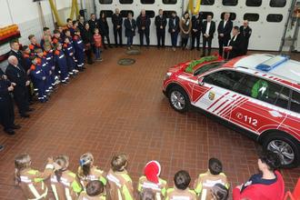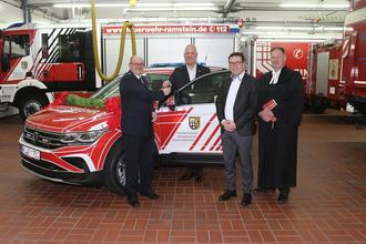 Nach dem Totengedenken stellte Pfarrer Bernard Schäfer den neuen Kommandowagen unter Gottes Schutz und Segen. Er wünschte den Einsatzkräften, dass sie stets aus ihren Einsätzen wieder unbeschadet zurückkommen. Anschließend überreichte Bürgermeister Ralf Hechler den Fahrzeugschlüssel symbolisch an Wehrleiter Preis. Hechler dankte den Feuerwehrfrauen und -männern einmal mehr für ihren selbstlosen Einsatz im Namen aller Bürgerinnen und Bürger der Verbandsgemeinde.