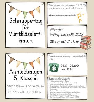 anbei veröffentlichen wir unsere Termine für den Schnuppertag und die Anmeldung für unsere 5. Klassen im Schuljahr 2024/2025. Bitte beachten Sie, dass vorab eine Anmeldung bzw. eine Terminvereinbarung notwendig ist.