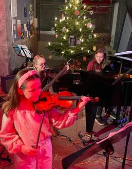 Das Herz der Veranstaltung bildeten musikalische Beiträge verschiedener Musikgruppen und einzelner Schülerinnen und Schüler aus verschiedenen Epochen der Musikgeschichte: Das Bläserensemble unter der Leitung von Philipp Huchzermeier, der Schulchor, die Schulband und das Streichensemble. Als Solisten bereicherten Fiona Tetzlaff und Stefan Schlipf den Abend mit der bewegend interpretierten "Romance lyrique" von Zoltàn Kodály. Ebenso mitreißend war die Darbietung des "Halleluja" aus dem "Messias" von Georg Friedrich Händel. Zum gemeinsamen Gesang lud der so kunstvoll vorgetragene Choral "Es kommt ein Schiff geladen" ein. Beide Beiträge wurden vom Streichensemble der Schule gestaltet: Rena von Essen-Spellmann und Dirk Janes an der Geige, einmal mehr Fiona Tetzlaff am Cello und David Blauth am Flügel. Unterstützt wurde das Ensemble vom Schulchor, der am Ende gemeinsam mit der Schulband aus der weihnachtlichen Musik unserer Zeit anstimmte. Das Programm trug damit fast Züge eines kleinen Weihnachtskonzertes und zeigte die große Bandbreite der musikalischen Arbeit am Reichswald-Gymnasium innerhalb und außerhalb des Unterrichts.
