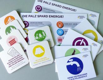 Vom Klimaschutzmanagement des Bezirksverbands Pfalz entworfen: Energiespar- und Klimatipps auf Pfälzisch in Form von Postkarten, Bierdeckeln und Flyern (Foto: Bezirksverband Pfalz).