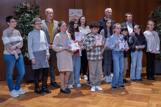 Alle 9 Schulsieger mit Juroren, Bürgermeister Ralf Hechler, Kreisbeigeordneter Jan Schneider und Büchereileiterin Michelle Müller.