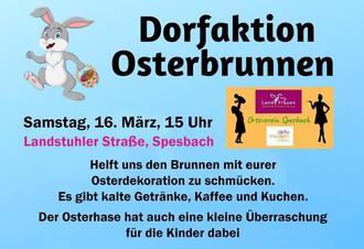 Am Samstag, dem 16. März schmücken die Landfrauen Spesbach zur Vorbereitung auf das Osterfest den Brunnen der Ortsgemeinde an der Ecke Ramsteiner Straße/Landstuhler Straße und laden ab 15:00 Uhr die Bevölkerung ein, auch in diesem Jahr gemeinsam mit ihnen und Vertretern der Ortsgemeinde das Osterbrunnen-Fest auf dem dortigen Parkplatz zu feiern.