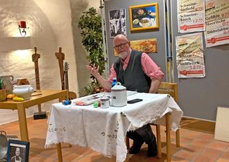 Unter diesem Motto bat Michael Geib bei seinem Gastspiel im Museum im Westrich am Mittwochabend die Besucher an seine „musikalische Tafelrunde“. Im gut besetzten Ratskeller brachte Geib mit einer abwechslungsreichen Mischung aus Mundartsongs, Texten und Erzählungen die Gäste zum Lachen. Ob Kartoffel, Saumagen, Dibbelabbes oder Bier, die Reise durch die pfälzische und saarländische Küche ließ keine Wünsche offen. Das Programm fügte sich nahtlos ein in das Thema der aktuellen Sonderausstellung des Museums zur Geschichte der Hausschlachtung in unserer Region.