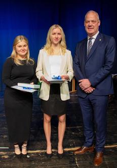 Bürgermeister Ralf Hechler überreichte den Preis der Sitzgemeinde Ramstein-Miesenbach an Emma Distler und Lilly Grimm (Foto: Stefan Layes).