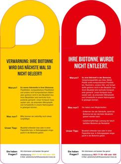 - Haben Sie einen roten Tonnenanhänger (s. Abbildung) an Ihrer Biotonne, dann war Ihr bereitgestellter Biomüll stark mit Störstoffen evtl. auch mit Schadstoffen verschmutzt und die Tonne wurde deshalb nicht entleert. Es findet in diesem Fall auch keine Nachfuhr statt.