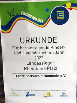 Der Ramsteiner Tanzsportverein darf sich über eine besondere Ehrung der Sportjugenden im Sportbund Rheinland-Pfalz freuen. Der Verein wurde für seine „herausragende Kinder- und Jugendarbeit im Jahr 2022“ mit einer Urkunde und Sachpreisen geehrt. Am Mittwoch vergangener Woche, 19. April, war die Preisverleihung im EDEKA-Center Jahke in Ramstein.