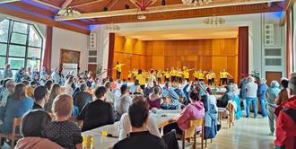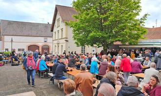 Sie alle waren begeistert vom Auftritt der Kinder aus der Protestantischen Kita „Regenbogen“, die mit ihrer Bienen-Präsentation für ein Blitzlichtgewitter sorgten. Als die Spielgemeinschaft Hütschenhausen gegen Mittag in beeindruckender Stärke im Hof des Bürgerhauses zum Konzert aufspielte, waren schnell alle Plätze belegt. Für das leibliche Wohl sorgten die Wirtin der Kegelbahn-Gaststätte mit schmackhaften Grillgerichten sowie der VdK-Ortsverband Hütschenhausen mit einem großen Kuchenbüffet.