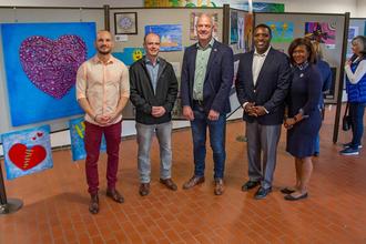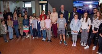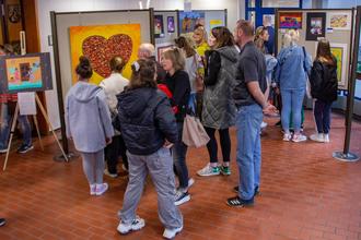 Bürgermeister Ralf Hechler begrüßte alle im Rathausfoyer, darunter auch den Kommandeur des 86. Lufttransportgeschwaders vom Flugplatz Ramstein, Brigadegeneral Otis C. Jones mit seiner Ehefrau Nataki, den Landeskoordinator für das „ WiR“ (Willkommen in Rheinland-Pfalz) Programm John Constance, den Leiter des Docu Centers Ramstein, Mario Aulenbacher sowie die Vertreter der Schulen. Hechler erinnerte daran, dass es bereits vor 10 Jahren erstmals ein gemeinsames Kunstprojekt der Schulen aus Ramstein-Miesenbach und der Militärgemeinde Kaiserslautern gab. Beeindruckt zeigte sich der Bürgermeister von den sehr unterschiedlichen Kunstwerken der Kinder und Jugendlichen, darunter auch Bilder von Kindern aus der Ukraine, die den schrecklichen Krieg in ihrer Heimat thematisieren.