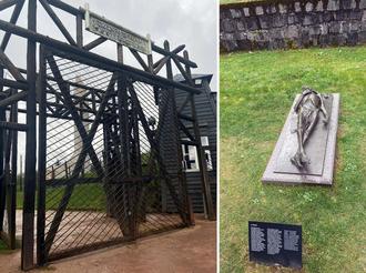 Das Eingangstor zum ehemaligen KZ Struthof und eine Bronzestatue des Bildhauers Georges Halbout (1895-1986), die einen ausgemergelten Deportierten darstellt.