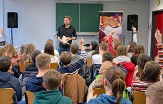 Abgerundet wurde die interaktive Lesung mit einer Fragestunde, in der die Schüler neugierig den Autoren befragten, in welchem Alter er sein erstes Buch verfasst habe, wer seine Bilder in seinen Werken zeichne, wie viel Zeit er von Beginn bis Fertigstellung einer Ausgabe benötige und schließlich, woher er all seine erstaunlichen Ideen nehme.