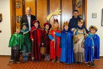 Königlicher Besuch im Rathaus in Ramstein: Die Sternsinger haben am Freitag vorm Dreikönigstag Bürgermeister Ralf Hechler in seinem Dienstzimmer besucht und den Segen „20 * C + M + B * 24“ an die Türen des Rathauses geschrieben. Die Buchstaben stehen für den lateinischen Segensspruch „Christus mansionem benedicat“ – Christus segne dieses Haus.