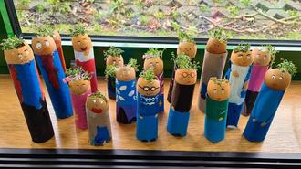 Die hergestellten Figuren zeigten eine echte bunte Gemeinschaft. Besonders toll war der Zusammenhalt der Klassengemeinschaft beim Arbeiten zu erkennen, da auch fehlende Kinder mit „hergestellt“ wurden und auch die Lehrerin als Teil der Gemeinschaft dargestellt wurde. Neben den künstlerischen Aspekten wurde auch das Wachstum der Kresse täglich beobachtet. Dies bot allerhand Nachdenkstoff auf unterrichtlicher Ebene (Einfluss der Sonne, Standort, Wasser, usw.) und führte schließlich zum passenden Ergebnis der unterschiedlichen Frisuren.