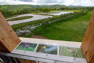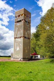 Der rund 20 Meter hohe Turm verschafft den Besuchern einen herrlichen Überblick auf die Wasserflächen des Kranichwoogs und die Wiesenlandschaft, die von Karpatischen Wasserbüffel beweidet wird.