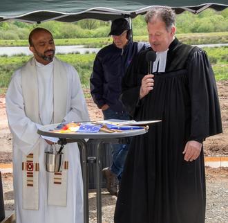 Pfarrer Bernahrd Schäfer und Kaplan Ebi Abraham stellten den neuen Turm unter den Schutz und Segen Gottes. Auf der Internetseite www.kranichwoog.de findet man vertiefende Inhalte zu den verschiedenen Themen des Erlebnisweges. Die Internetseite wird von der Kreisverwaltung Kaiserslautern bereitgestellt und von der Unteren Naturschutzbehörde betreut. (Fotos: Stefan Layes)